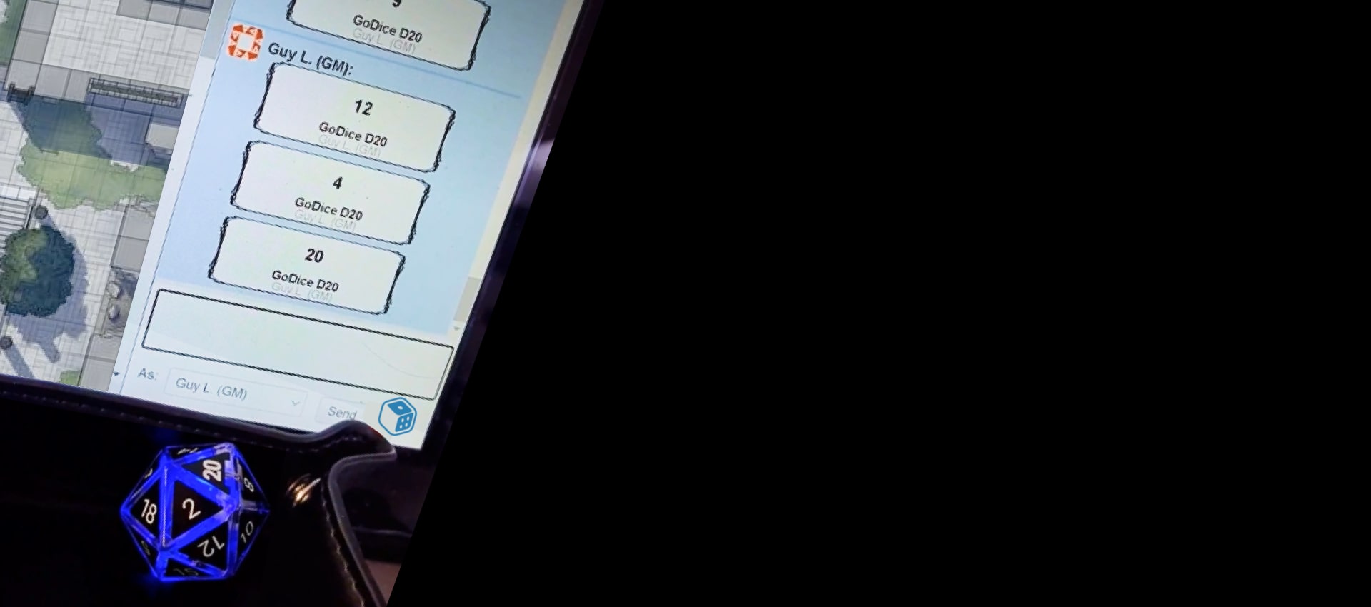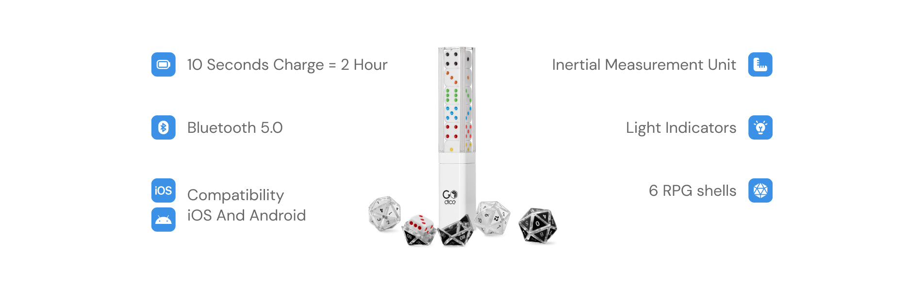 Eine leistungsstarke Kombination aus sechs verbundenen Würfeln und sechs RPG-Hüllen, die sie in beliebige polyedrische Würfel verwandeln. Spielen Sie Online-RPG, indem Sie echte Würfel mit Echtzeit-Feedback und automatischen Berechnungen werfen. GoDice verbindet sich über eine intuitive Chrome-Erweiterung mit Roll20, FoundryVTT und Discord sowie mit der kostenlosen Begleit-App GoDice™, die viele Würfelspiele und einen praktischen RPG-Würfelrechner bietet.