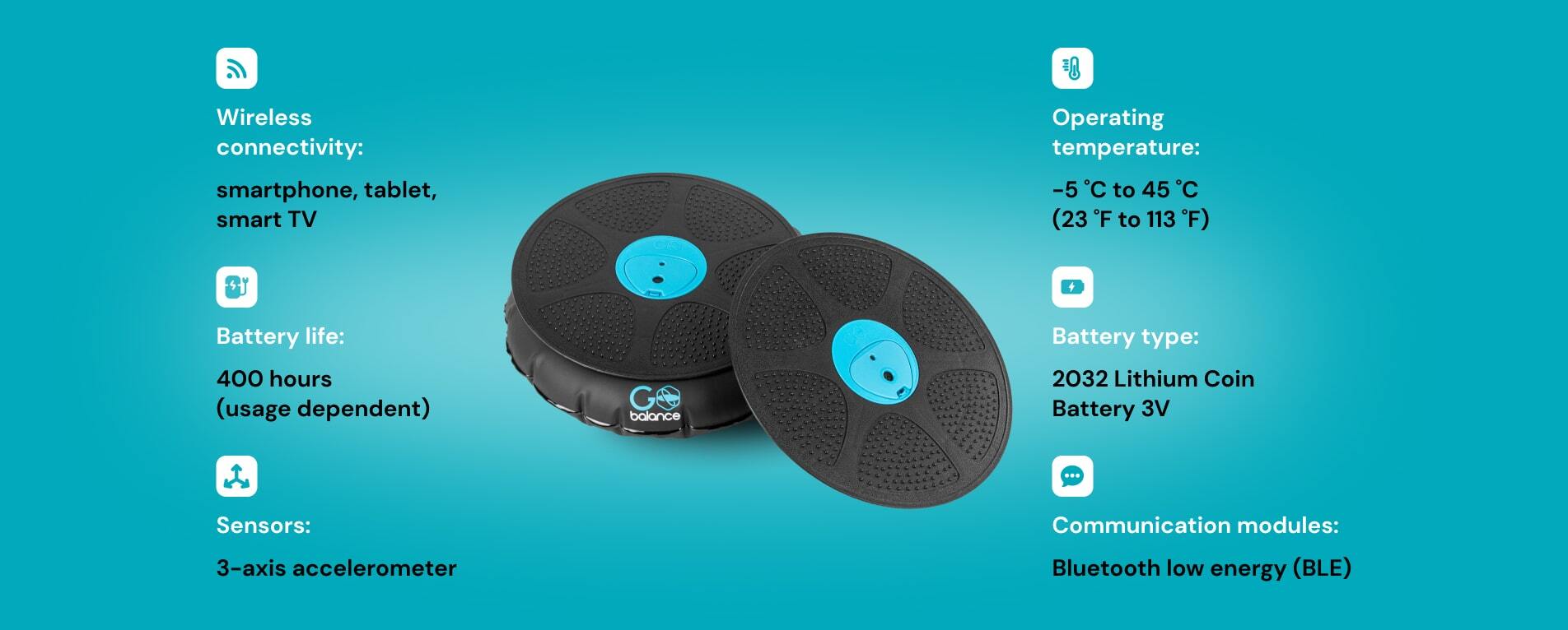 GoBalance Play et GoBalance Sport utilisent une pile au lithium standard CR2032 qui dure environ 200 heures de temps de jeu d'équilibre. La pile peut être facilement remplacée